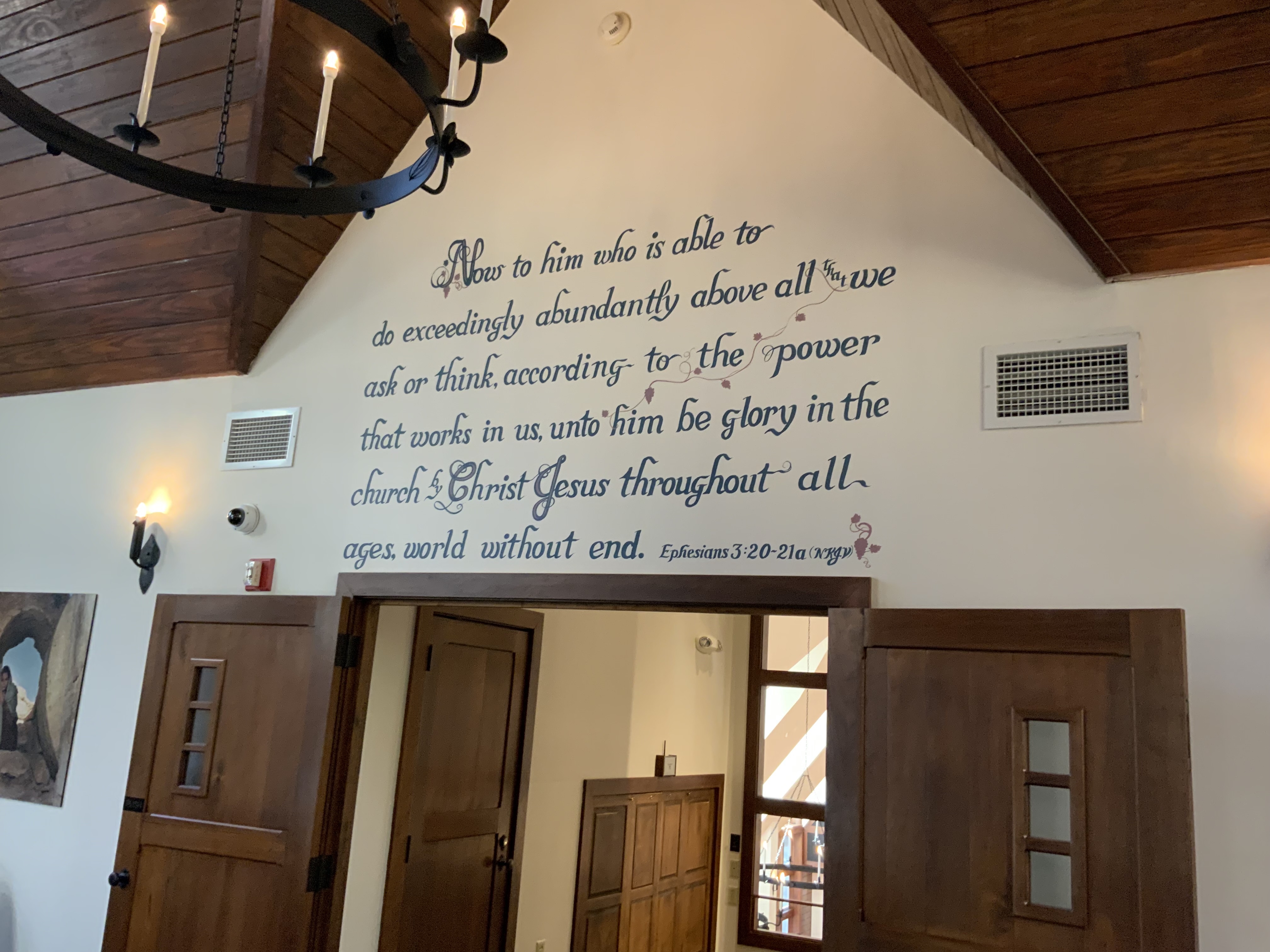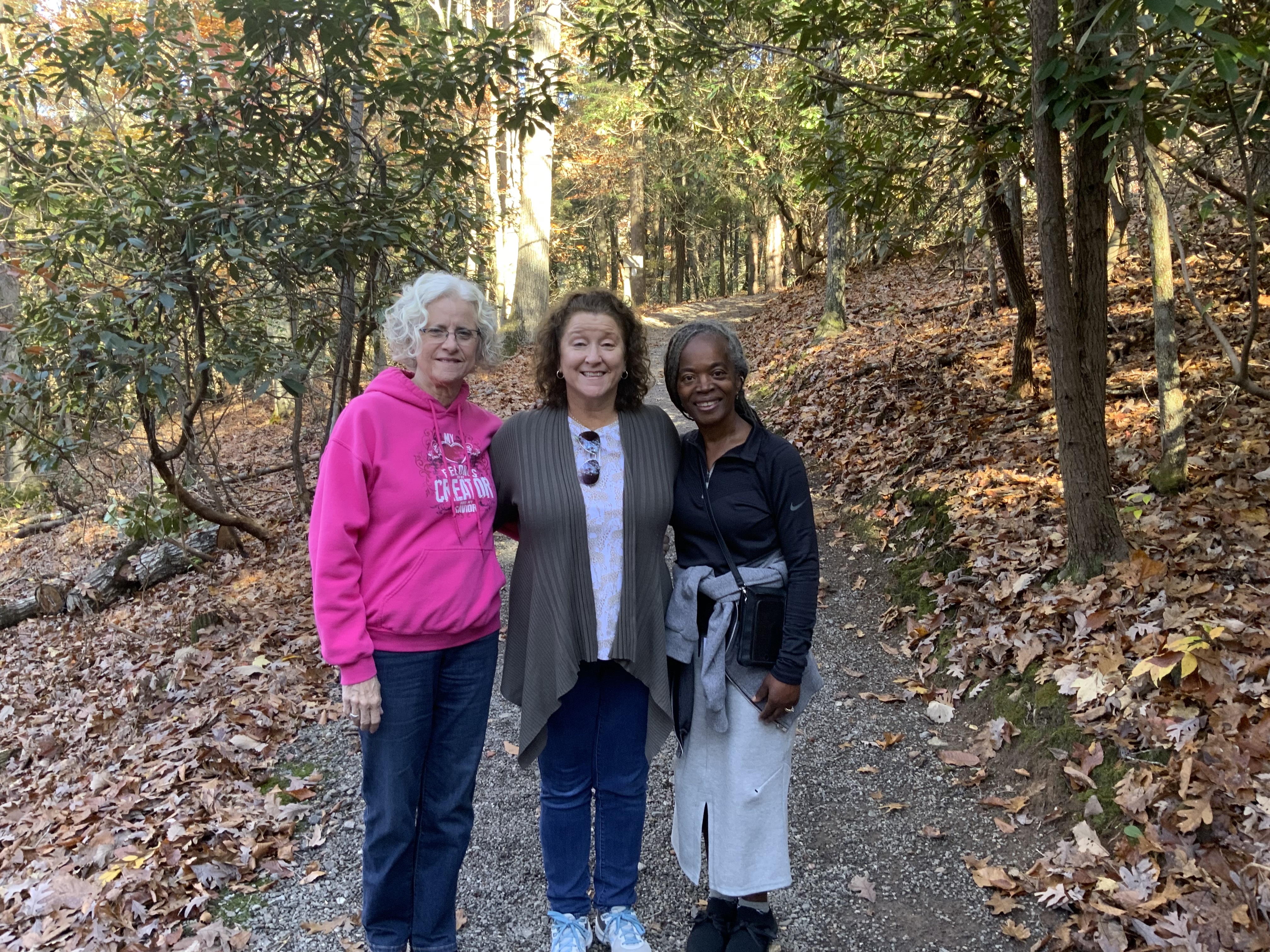 The sessions were encouraging and testimonies shared were beautiful. Lauren and Barbara were my trail buddies walking to the chapel. I thought the trails were all paved but not the one we took. It was gravel and leaves covered a small part of it. They made sure I didn’t trip on the rocks, roots and uneven ground. We stopped at each scripture post and one of them would sign what it said. Barbara wanted to find the little mountain creek and listen to the soothing sounds of the water. (She can hear that with her hearing aids). We got to the chapel and let me tell you….that place is gorgeous! In the upper prayer room we knelt down to pray. It was a beautiful experience.