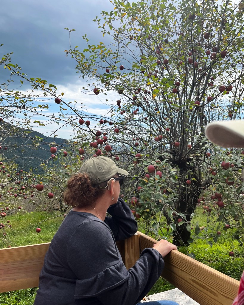 The orchard has a gorgeous backdrop of mountains. I was sitting in the front corner of the wagon and turned staring in awe. Tree after tree covered with a variety of apples. Some were red, green and yellow. Some sweet and others tart. After the wagon ride, I bought a bucket so I could experience harvesting apples. The guide explained how to know if the apples were ready. Apples ready for picking came right off once I pulled and twisted the steam. I came across some that were not ready and some trees we skipped completely because that particular variety had a different harvest time. It did not take long to fill my bucket with apples then I headed back to meet my friends.