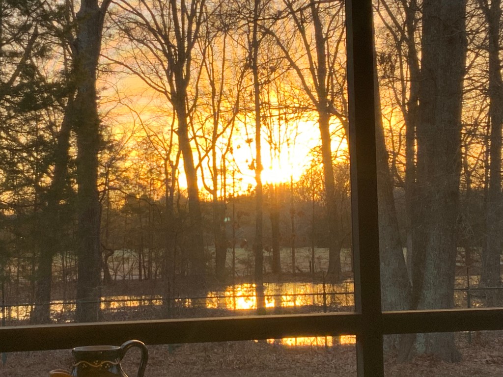This morning as I let our dog outside I noticed the milder temperature and decided to have my quiet time out on the back porch. As I watched the sun rise I prayed and thanked God for all He is! I am always awestruck by nature. The heavens declare the glory of the Lord. Whether it be a sunrise, sunset or the beautiful moon, I delight in seeing them all. I can no longer see the stars. I’ve always wanted to look through a telescope to see the beauty of the night sky.