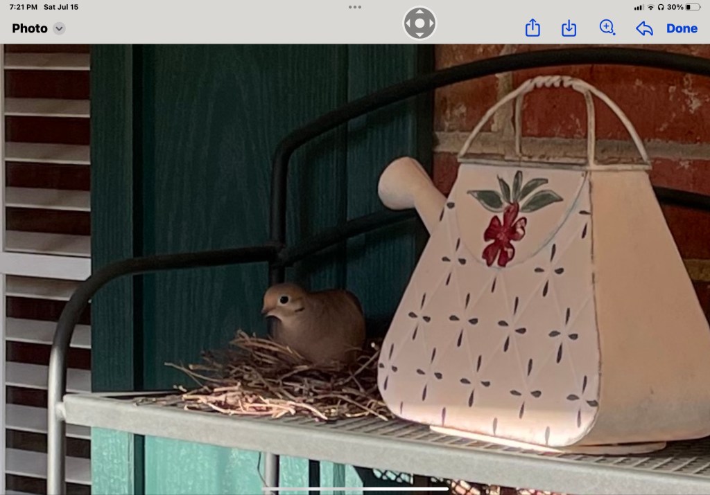 Later when Ron got home I asked him to see if she was on her nest and try to get a picture. I wanted to zoom in and see what she looked like. Technology is marvelous when you cannot see well. Ron took the picture and sent it to me. Zooming in, I took a screenshot then posted it online to find out what kind of bird it was. It turns out that it’s a mourning dove. To think that dove has been nesting on our porch for months made my heart so happy. My eyes filled with tears as I thought of the biblical significance of a dove. The Holy Spirit and hope came to mind.
