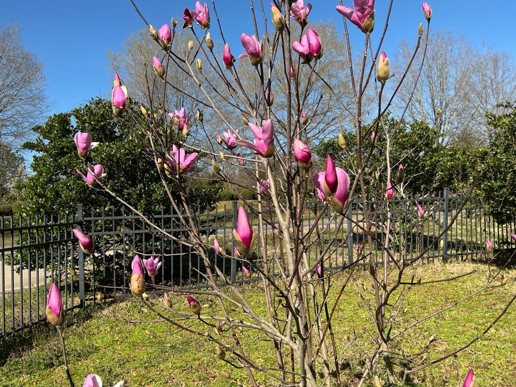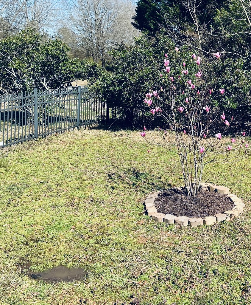 It’s priceless to reach a point in life where you literally can crack up at your mistakes. Truth be told, I’m planning to blog tomorrow night but had no plans to write today BUT this cracked me up and perhaps you need a laugh of your own today. I got a text from my cousin Craig earlier, with tomorrow being Dad’s Heavenly birthday. I made a mental note to go out and check on the Tulip tree we planted in his honor almost four years ago. The blooms are opening and it brought such joy. I asked Ron if we could get some more dirt, mulch and stones to go around it. Home Depot didn’t have any matching stones but I did lay the dirt and mulch down. Ron told me to wait because it was really wet from yesterday’s rainfall, but I insisted on doing it. I wanted to take a picture of the blooms, not necessarily the whole tree. Ron threw away the bag the mulch was in not knowing I planned to sit on it and take a picture of the blooms with the blue sky as a backdrop. Inside, I grabbed my iPad and set the camera on. I have a hard time seeing the iPad screen in sunlight so I got it ready to take my pictures. I knelt down by the tree and was about to take a picture when I lost by balance and my behind fell right in a puddle of rainwater, my behind then iPad. What a sight! I died laughing at my clumsiness but got up and attempted to take the pictures anyway. When I got in the garage I checked and not a single picture made it. I died laughing again and Ron came to investigate, and lo and behold my butt, leg and shoes were a muddy mess! He kind of got onto me because he said I could have hurt my back again but I didn’t. He said he would go out and take the pictures for me. He came in to show me, and it wasn’t want I had tried to do at all. I explained I wanted to see the details of the blooms not the tree, so he went back out and tried again. This time he got it right. I love the beauty of this tree and the hope of new life it brings each year. Dad would be laughing at what it took to get these pictures. It cracked me up as well, although Ron, not so much.